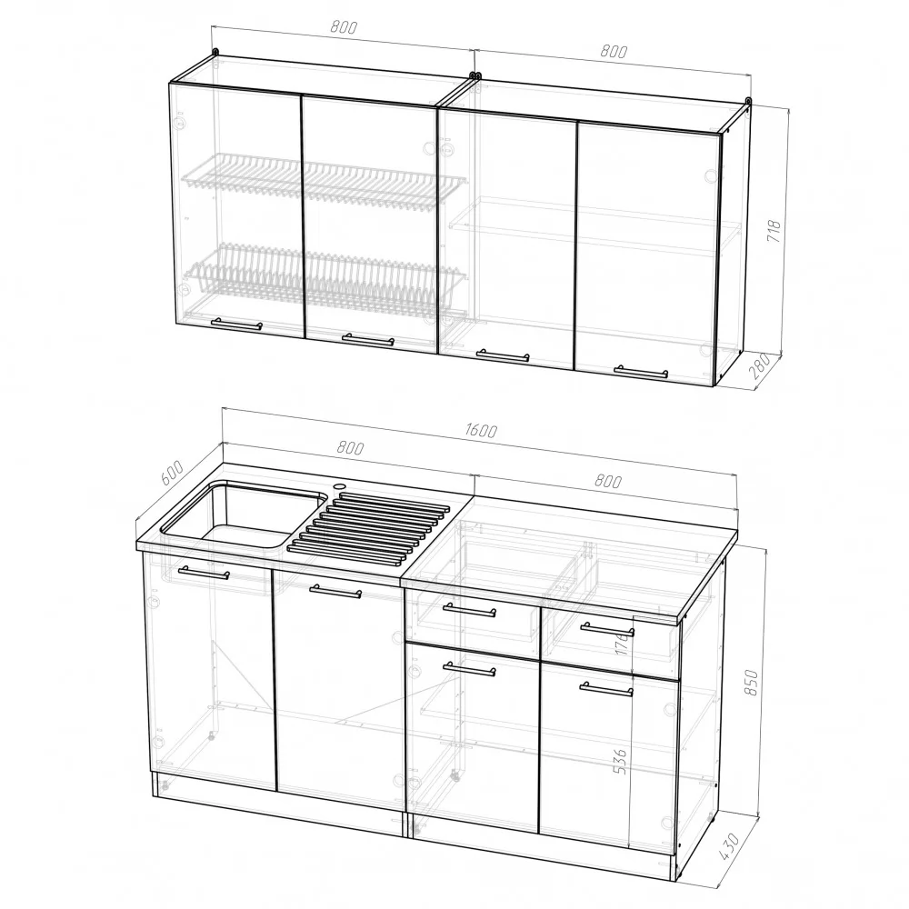 Мойки, смесители и посудосушители в комплекты гарнитуров не входят.