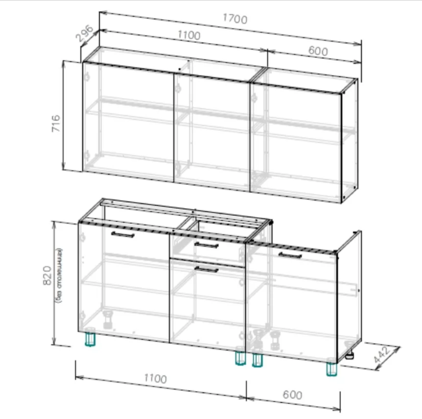 Навесы шкафов Р-образные, не регулируемые.