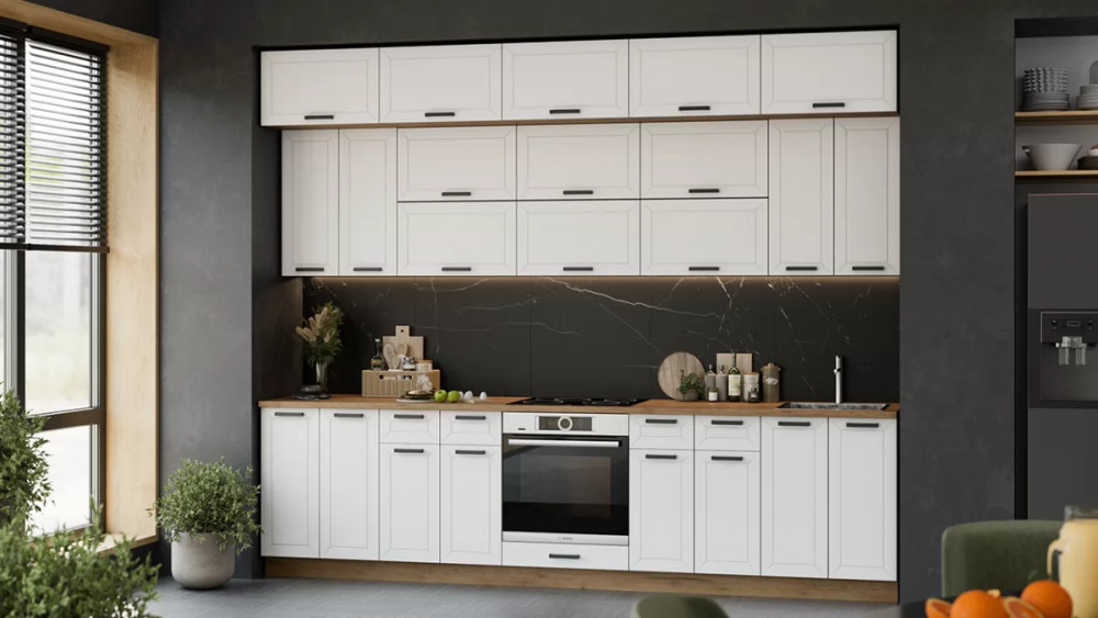 В стоимость не включено: Стеновая панель, столешница, доводчики, бытовая техника, мойка, смеситель, аксессуары