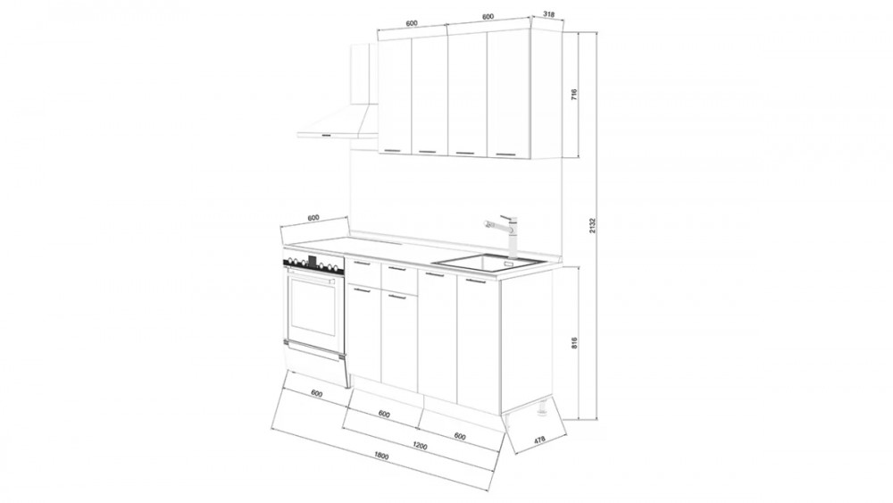 Габаритный размер готового набора модулей с учетом газовой плиты на 60 см: 1 800