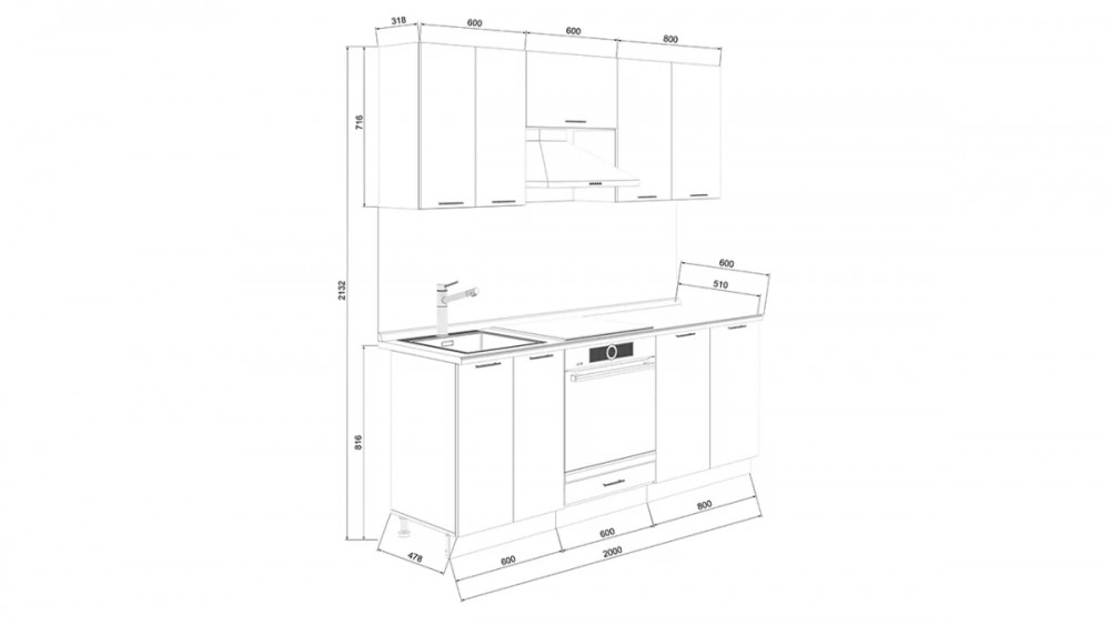 Габаритный размер готового набора модулей с учетом газовой плиты на 60 см: 2 000