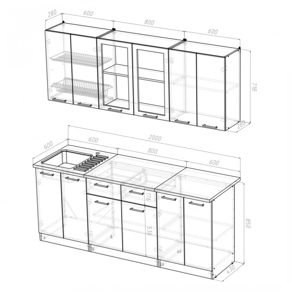 Мойки, смесители и посудосушители в комплекты гарнитуров не входят.