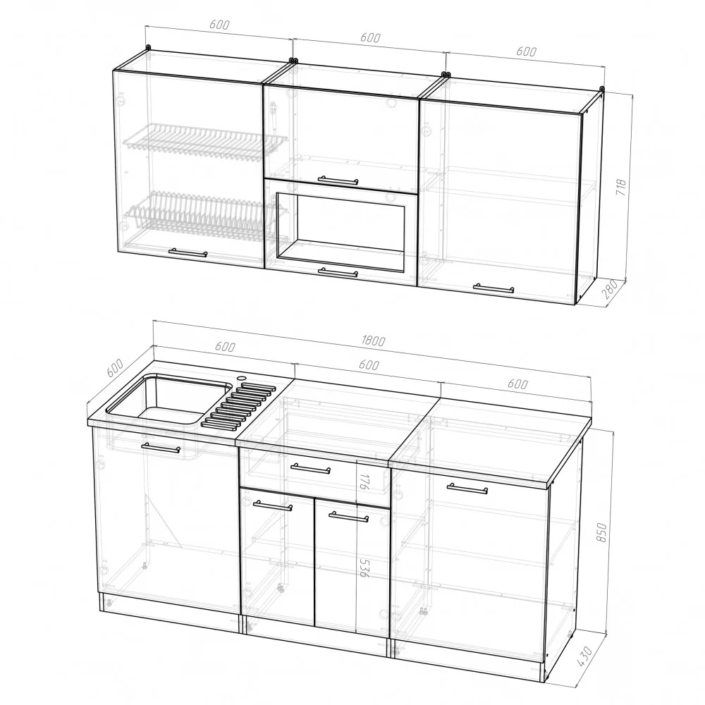 Мойки, смесители и посудосушители в комплекты гарнитуров не входят.