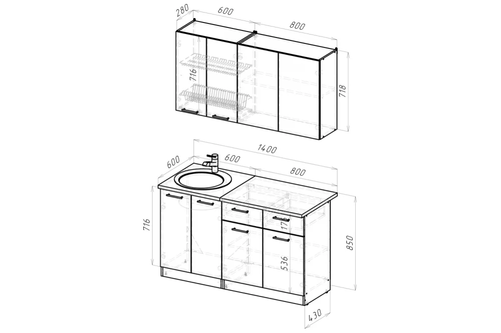 Мойки, смесители и посудосушители в комплекты гарнитуров не входят.