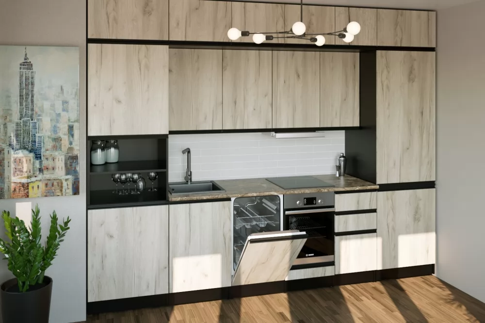 Прямые готовые кухни рациональны для маленьких квартир. При прямой планировке кухни важно предусмотреть место для холодильника и учесть его габариты. Если ваша кухня объединена с гостиной, или же настолько просторная, что позволяет сделать полноценную обеденную зону для большой семьи, то смело выбирайте линейную конфигурацию кухни.
