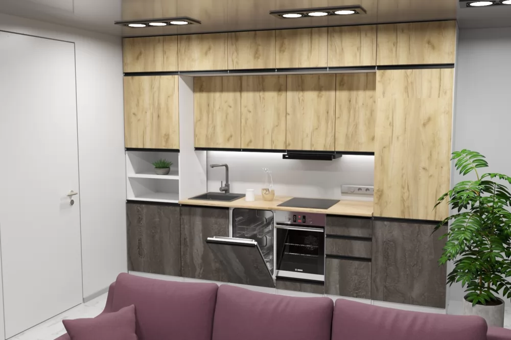 Прямые готовые кухни рациональны для маленьких квартир. При прямой планировке кухни важно предусмотреть место для холодильника и учесть его габариты. Если ваша кухня объединена с гостиной, или же настолько просторная, что позволяет сделать полноценную обеденную зону для большой семьи, то смело выбирайте линейную конфигурацию кухни.