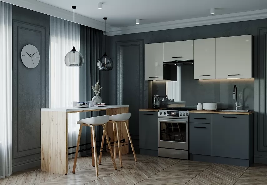 - Столешницы цельные со скруглением по переднему краю, пластиковым покрытием и силиконовый каплесборник (защищает фасады нижних модулей от попадания влаги и разбухания);
