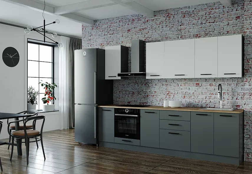 - Столешницы цельные со скруглением по переднему краю, пластиковым покрытием и силиконовый каплесборник (защищает фасады нижних модулей от попадания влаги и разбухания);
