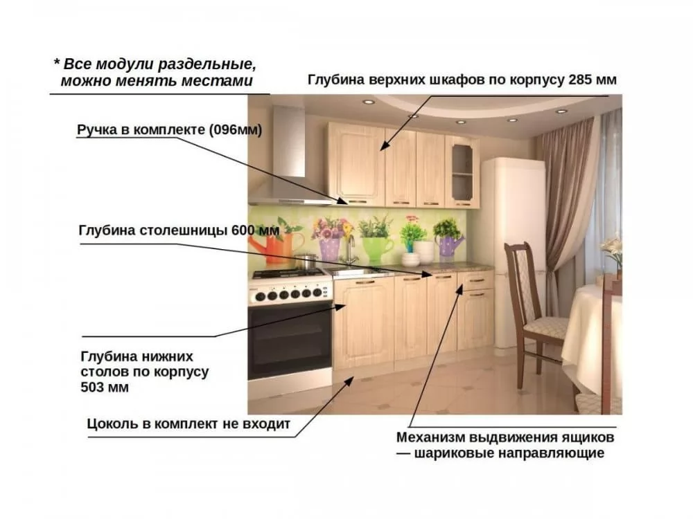Кухонная мойка, стеновая панель, посудосушитель, цоколь, планки для столешницы в комплект не входят.