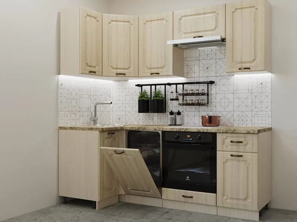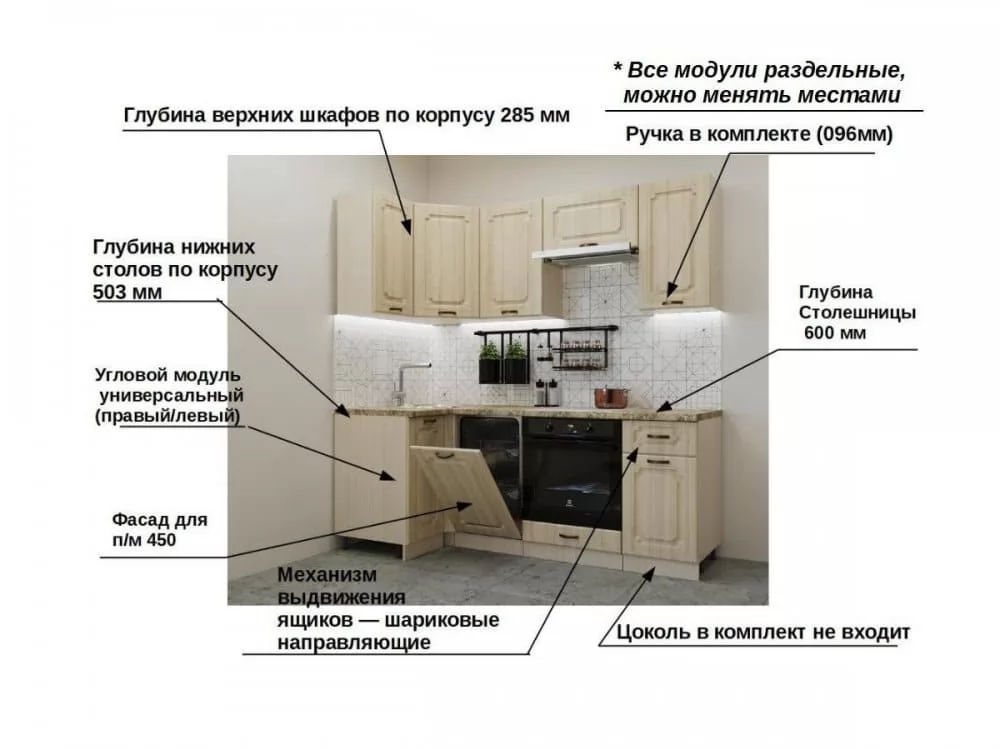 Кухонная мойка, стеновая панель, посудосушитель, цоколь, планки для столешницы в комплект не входят.