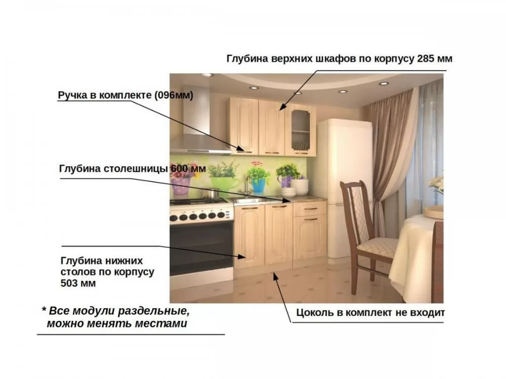 Кухонная мойка, стеновая панель, посудосушитель, цоколь, планки для столешницы в комплект не входят.