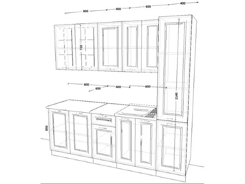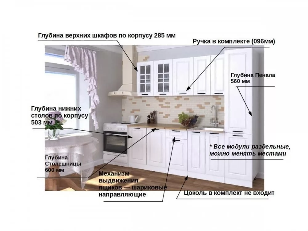 Кухонная мойка, стеновая панель, посудосушитель, цоколь, планки для столешницы в комплект не входят.