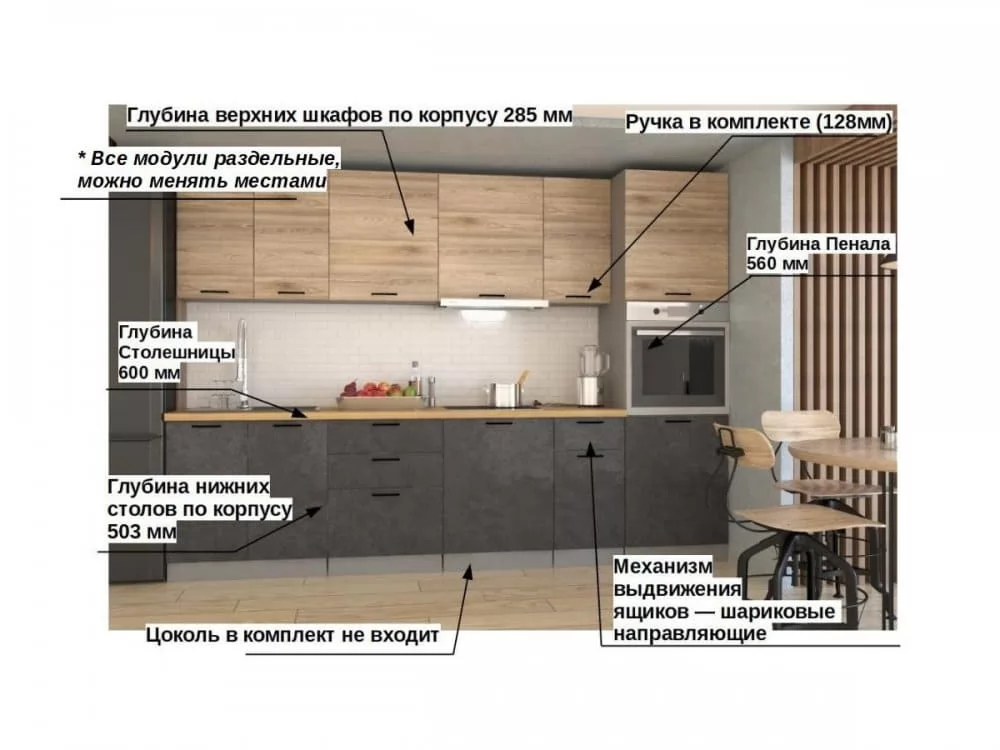 Кухонная мойка, стеновая панель, посудосушитель,цоколь, планки для столешницы в комплект не входят.