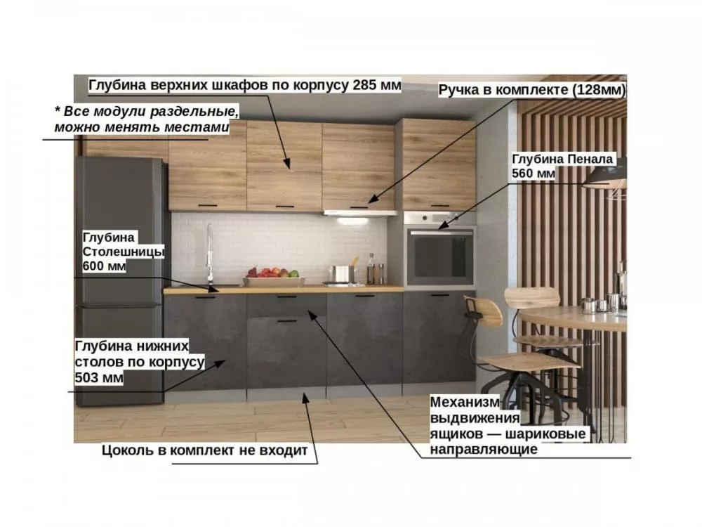 Кухонная мойка, стеновая панель, посудосушитель,цоколь, планки для столешницы в комплект не входят.