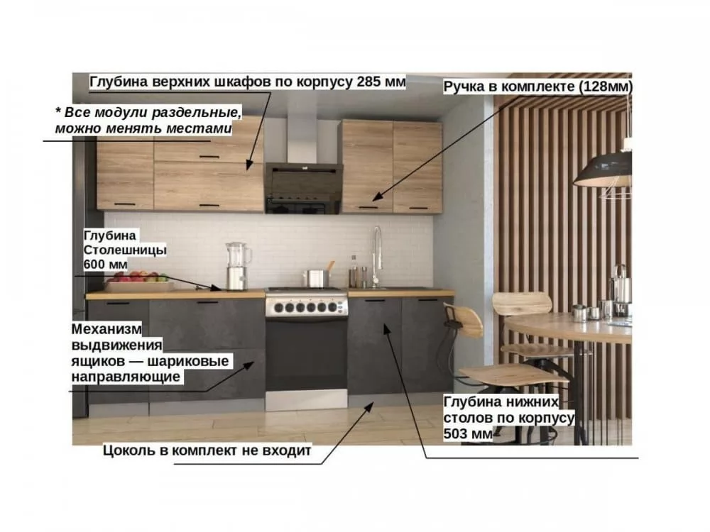 Кухонная мойка, стеновая панель, посудосушитель,цоколь, планки для столешницы в комплект не входят.