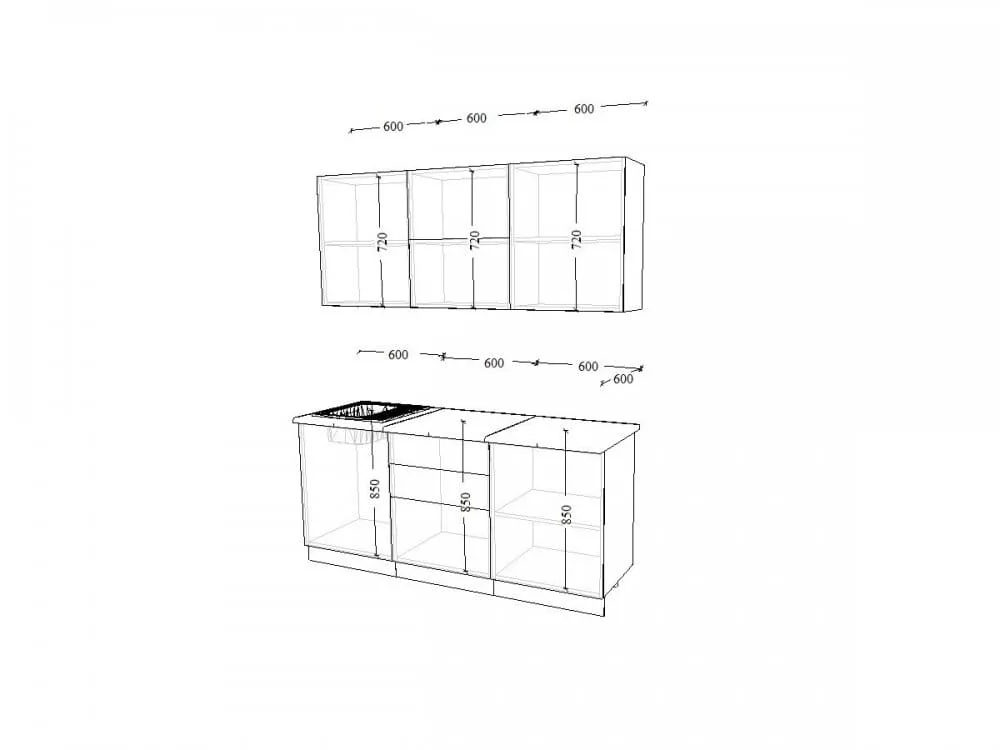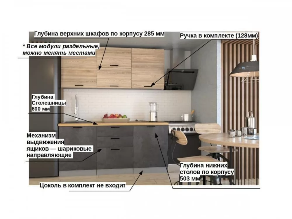 Кухонная мойка, стеновая панель, посудосушитель,цоколь, планки для столешницы в комплект не входят.