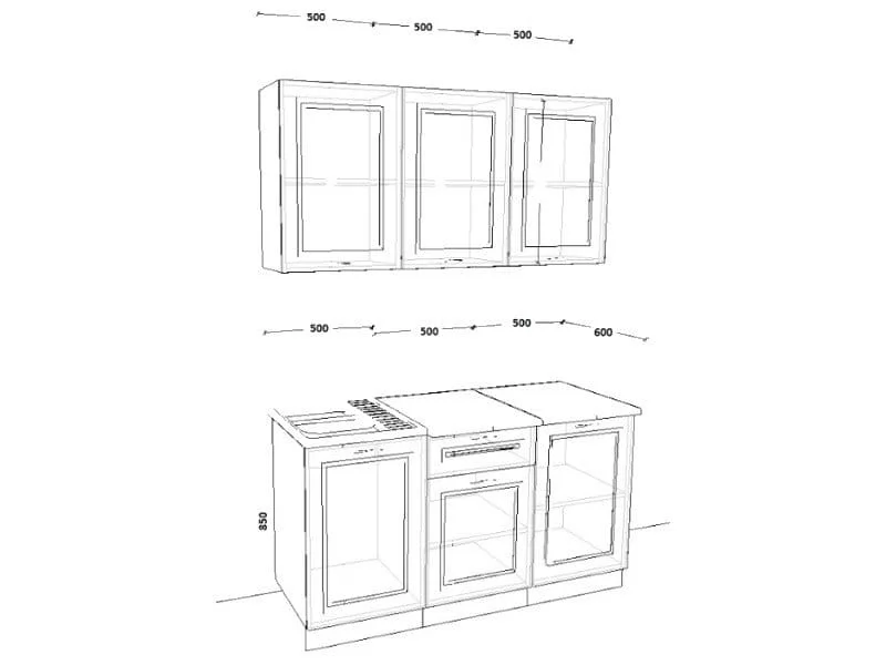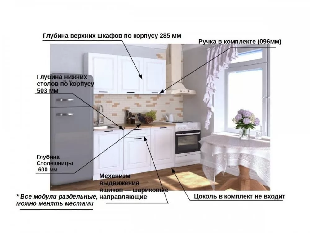 Кухонная мойка, стеновая панель, посудосушитель, цоколь, планки для столешницы в комплект не входят.