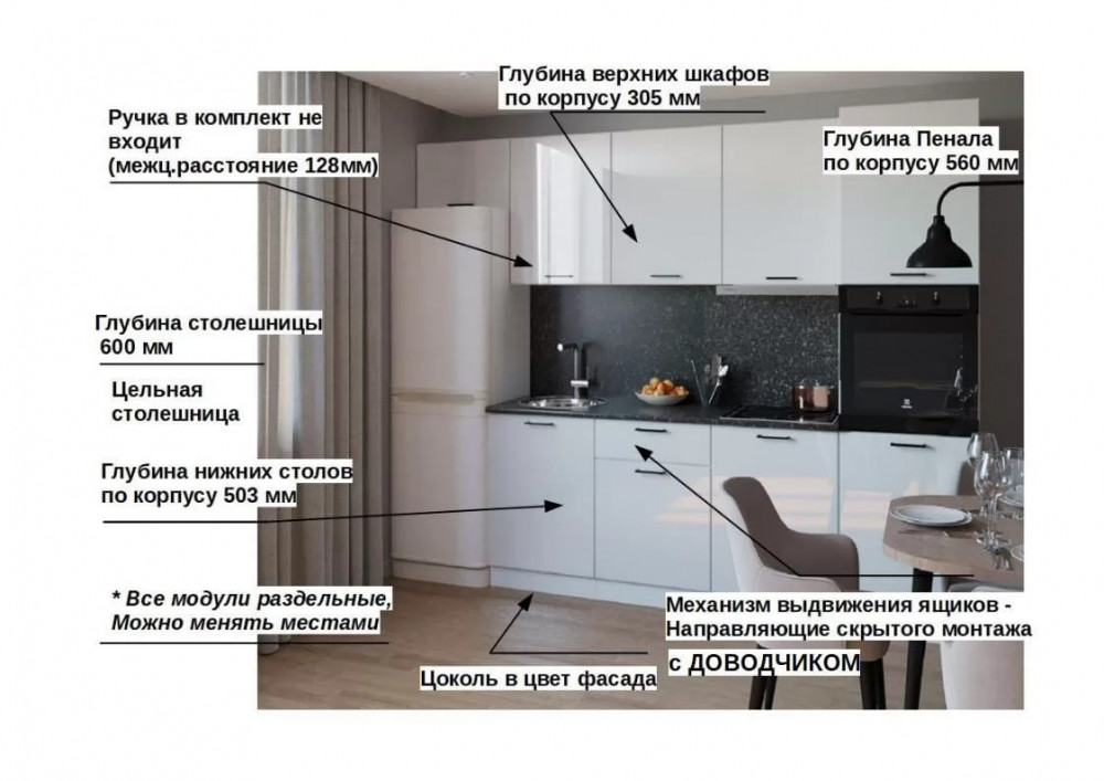 Кухонный прямой гарнитур арт.7, 3000 мм, Белый глянец