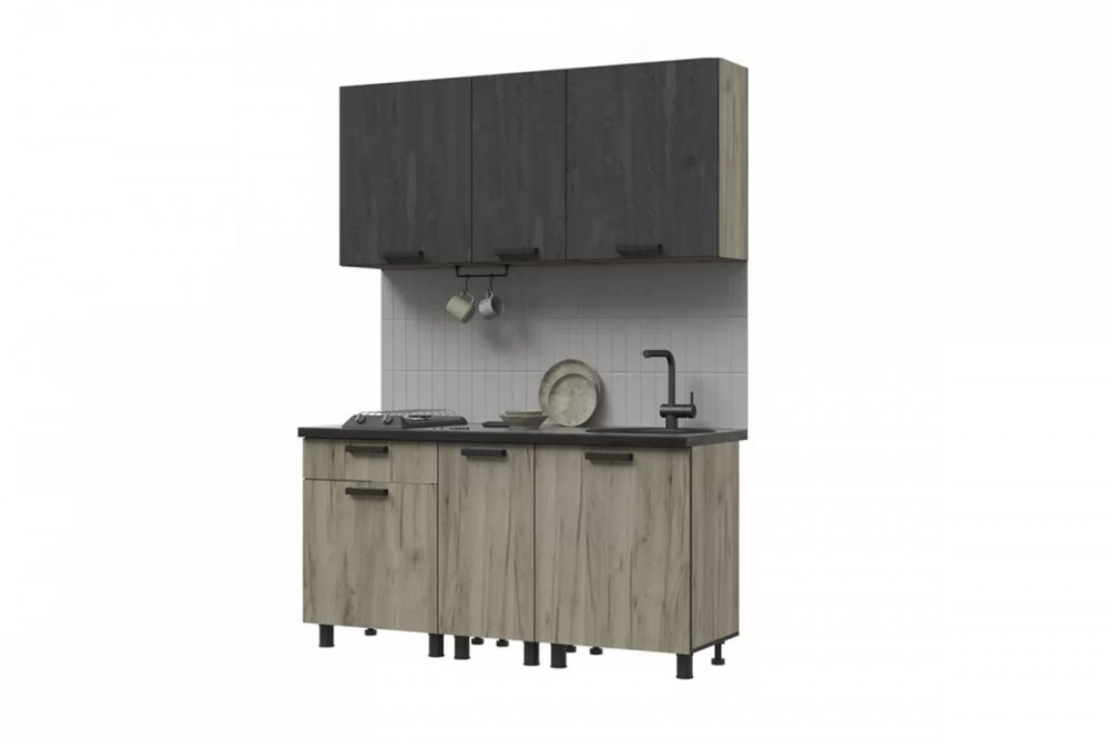ЭДИНБУРГ Кухня 1.6м, ЛДСП Дуб Крафт Сер/ЛДСП Желез.камень ПФ(38)Черный (б/сушк,мойк