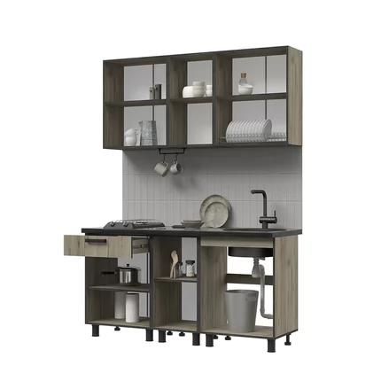 Габаритные размеры верхних модулей: ш*в*г 1600*716*318 мм. Два модуля по 600 мм и модуль 400 мм с полками, с глухими распашными створками. Габаритные размеры нижних модулей: ш*в*г 1600*854*600 мм с учетом высоты опор и столешницы. Модуль под мойку 600 мм, модуль 600 мм с ящиком и полкой и модуль 400 мм с полкой.