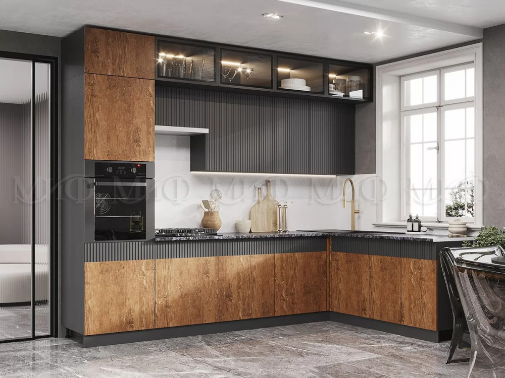 Кухня Оливия NEW 3,0х1,8м (Графит/Экзотическое дерево Амазония/Графит софт)