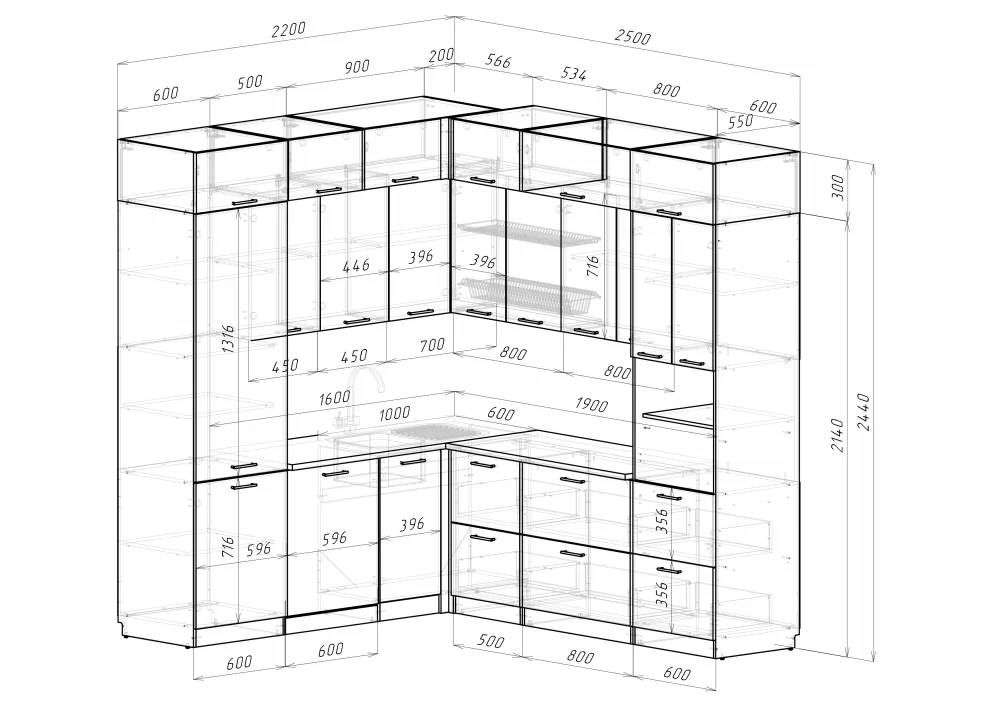Мойки, смесители, посудосушители, варочные панели, духовые шкафы, плиты, вытяжки в комплекты гарнитуров не входят.
