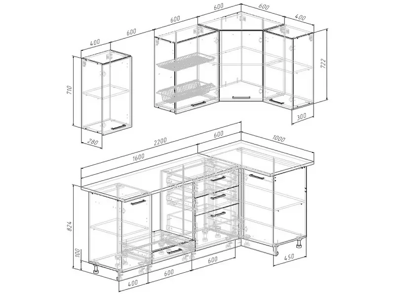 - Фасады верхних модулей со свесом – дают возможность использовать модули без установки ручек, а также установить скрытую подсветку;