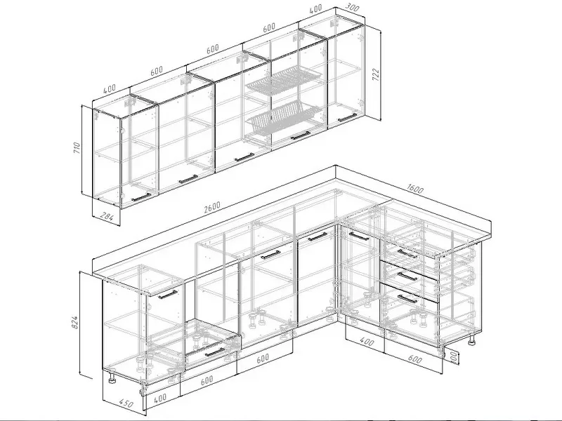 - Фасады верхних модулей со свесом – дают возможность использовать модули без установки ручек, а также установить скрытую подсветку;