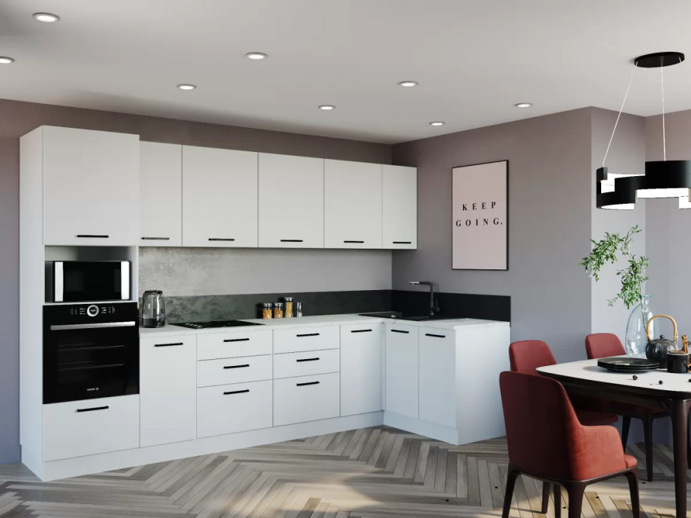 - Столешницы цельные со скруглением по переднему краю, пластиковым покрытием и силиконовый каплесборник (защищает фасады нижних модулей от попадания влаги и разбухания);