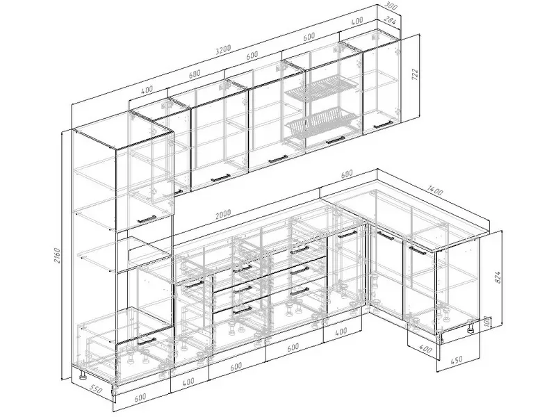 - Фасады верхних модулей со свесом – дают возможность использовать модули без установки ручек, а также установить скрытую подсветку;