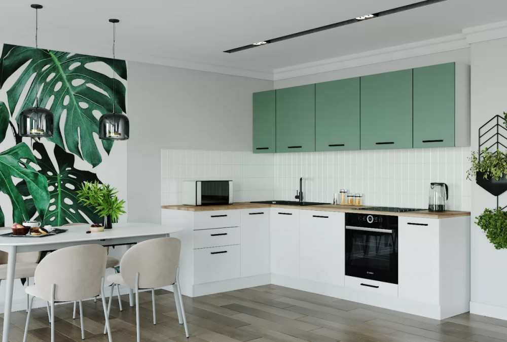 - Столешницы цельные со скруглением по переднему краю, пластиковым покрытием и силиконовый каплесборник (защищает фасады нижних модулей от попадания влаги и разбухания);