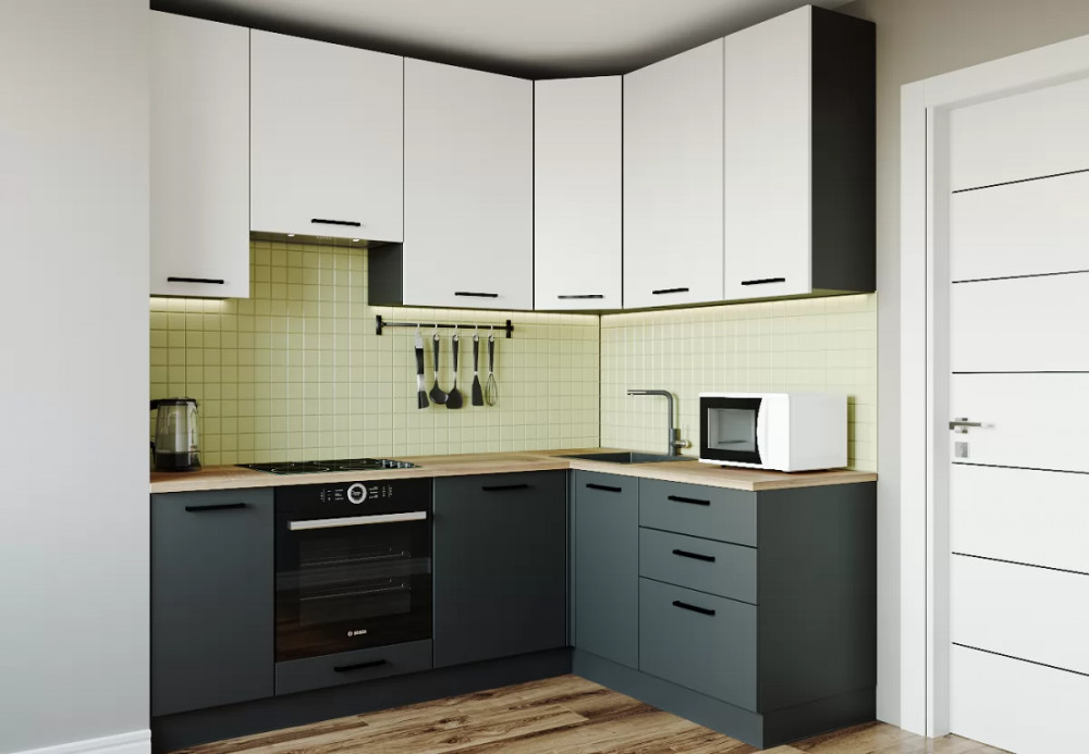 - Столешницы цельные со скруглением по переднему краю, пластиковым покрытием и силиконовый каплесборник (защищает фасады нижних модулей от попадания влаги и разбухания);