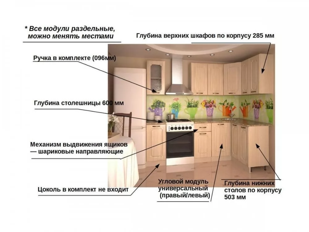 Кухонная мойка, стеновая панель, посудосушитель, цоколь, планки для столешницы в комплект не входят.