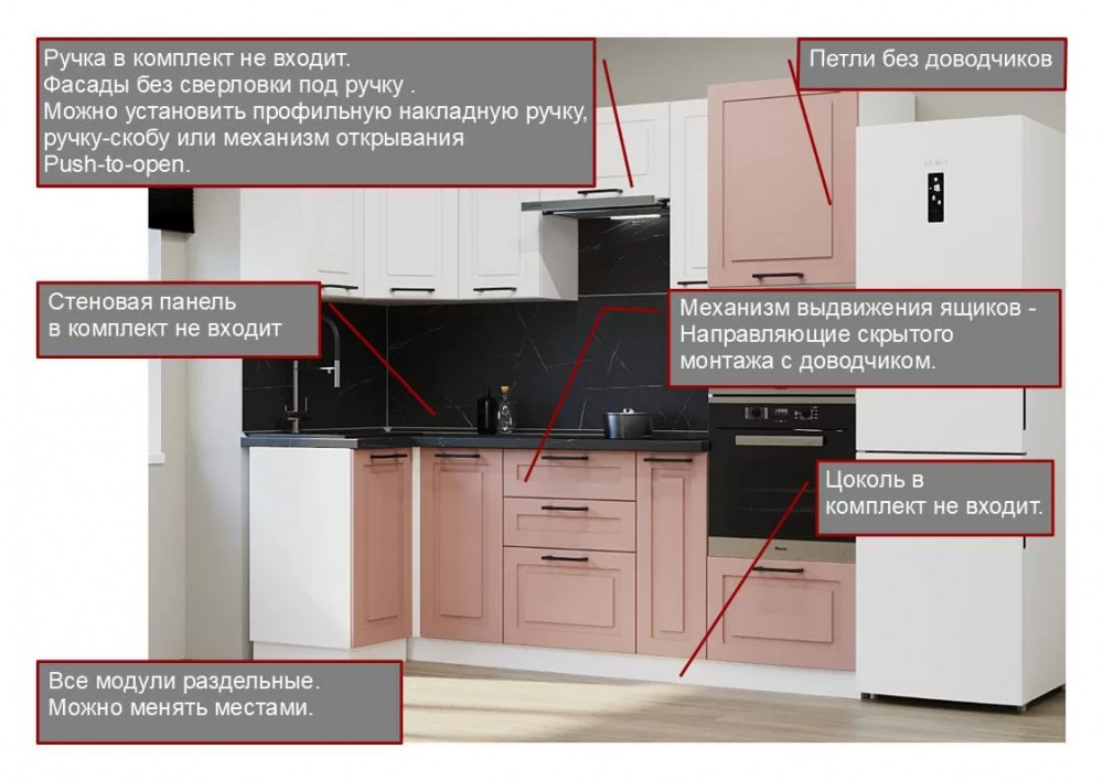 Кухонный угловой гарнитур Аликанте арт.1, 1000х2400 мм, Шарли белый/Шарли Pink
