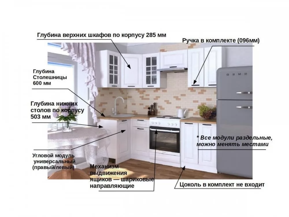 Кухонная мойка, стеновая панель, посудосушитель, цоколь, планки для столешницы в комплект не входят.