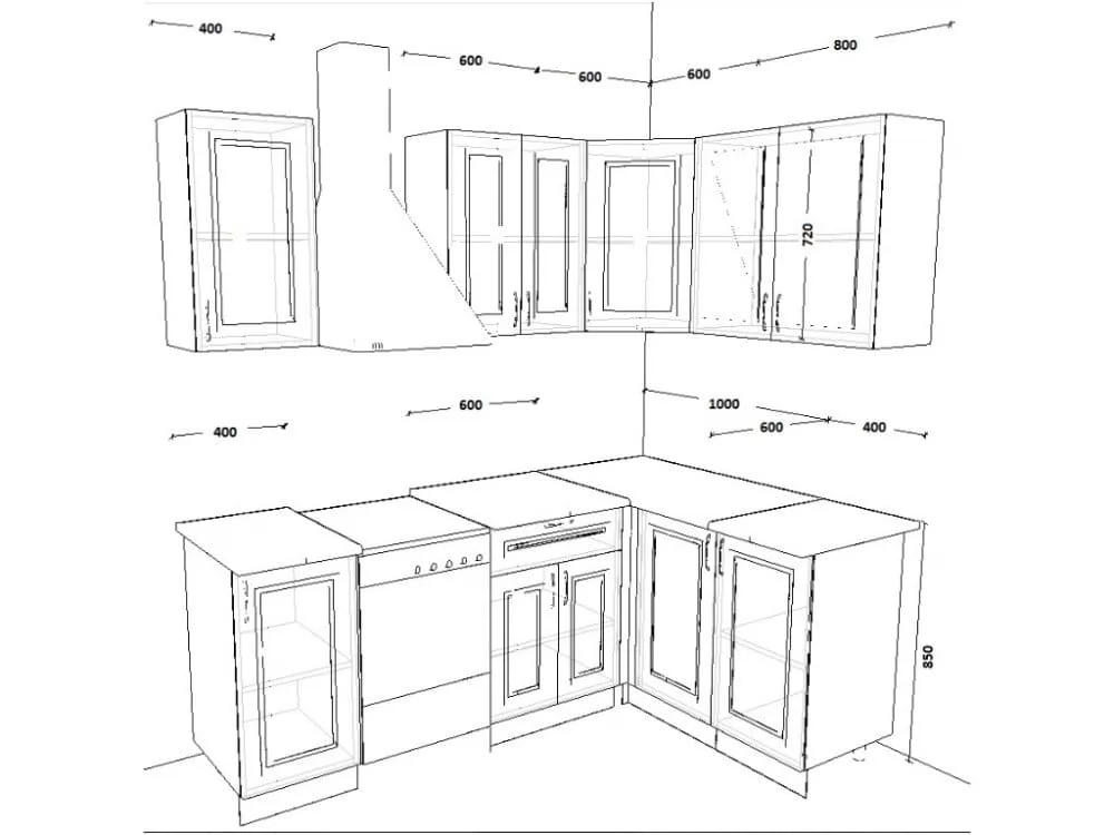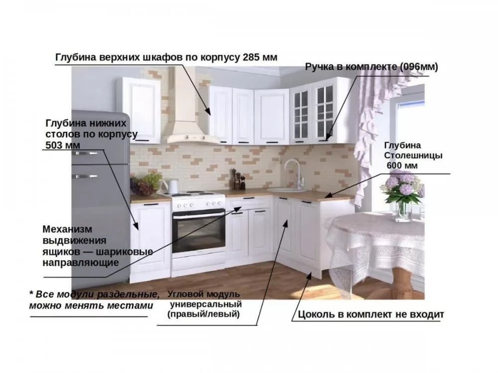 Кухонная мойка, стеновая панель, посудосушитель, цоколь, планки для столешницы в комплект не входят.