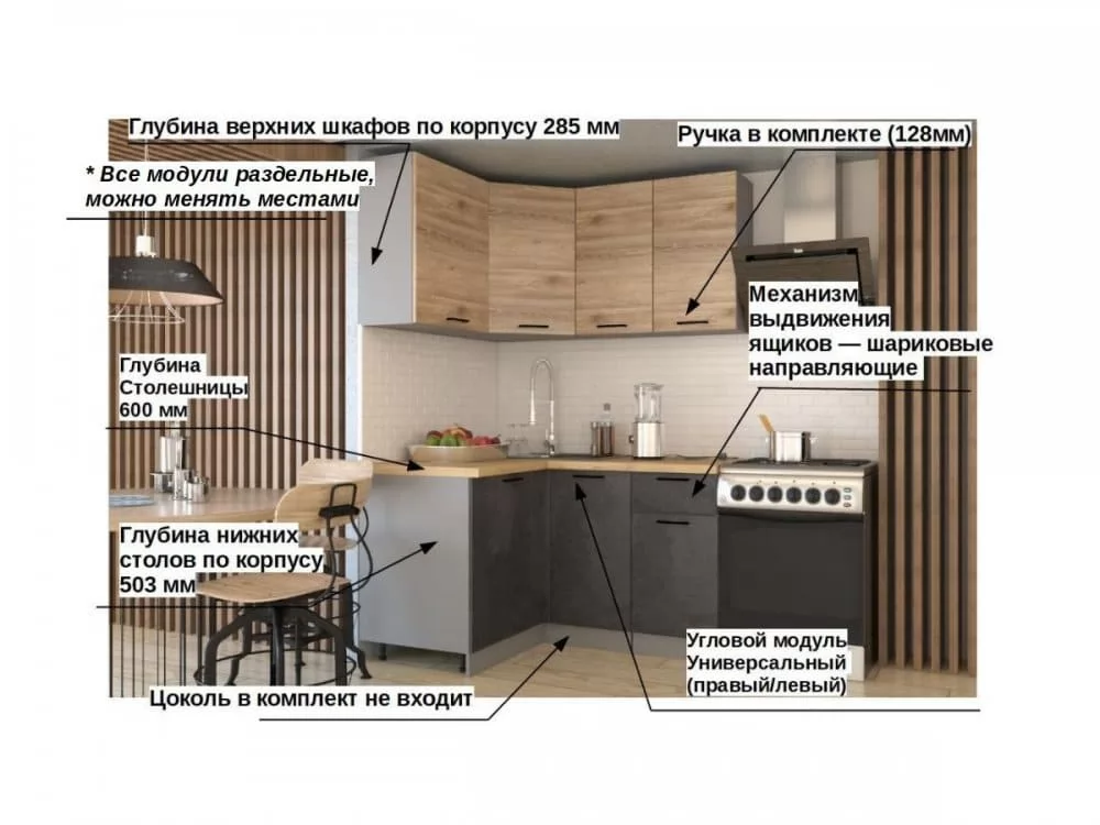 Кухонная мойка, стеновая панель, посудосушитель,цоколь, планки для столешницы в комплект не входят.