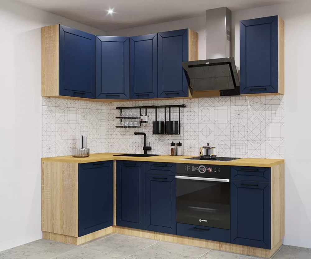 Синяя кухня всегда привлекает к себе восторженные взгляды, преображает окружающую обстановку и делает ее более легкой и свежей. Сдержанный и элегантный тандем в сочетании с грамотно расставленными яркими акцентами, будет смотреться очень уютно. Отличным компаньоном для синего станут корпус и столешница под светлое дерево.