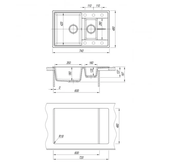 Ширина мойки, мм: 740