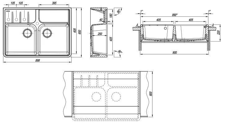 Ширина мойки, мм: 898