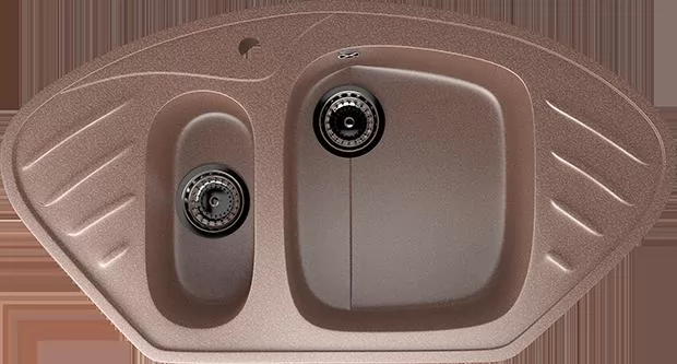 Угловая двухсекционная мойка с отверстием под смеситель.Гарантия: 2 г.Логистическая информация: картонная коробка (ШхГхВ)1050х550х300,0,155м3,брутто 28,5кг.Комплектация:фреза,герметик,сливная арматура