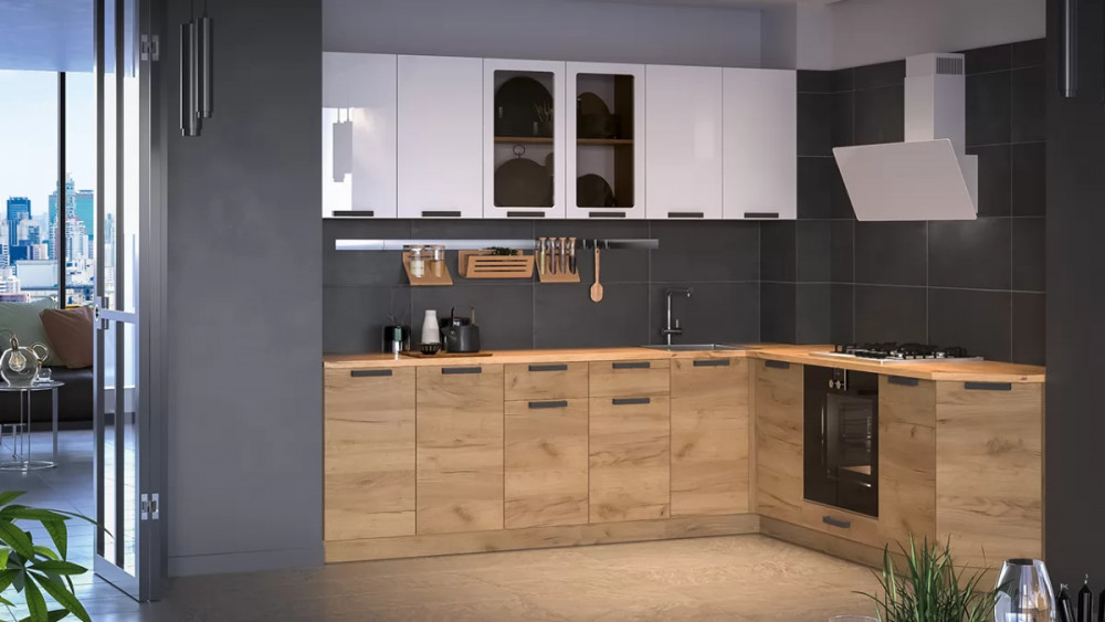 Модульная кухня «Детройт» Дуб крафт золотой/Белый глянец/Угольный камень