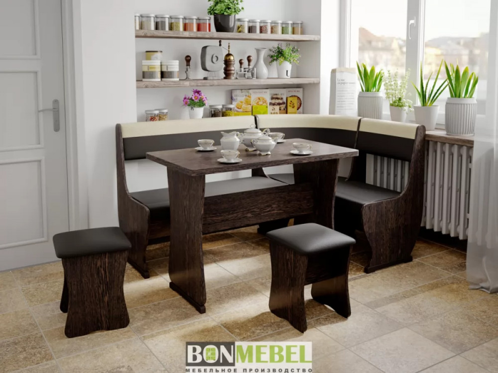 Небольшой кухонный уголок с мягкой обивкой в элегантном современном стиле. Модель, подходящая к большинству интерьеров, и создающая атмосферу уюта и комфорта на вашей кухне. Сборка скамьи универсальная — вы можете определить угол как с правой, так и с левой стороны.