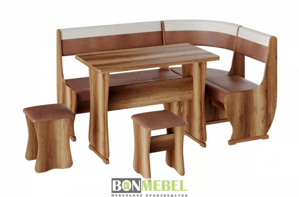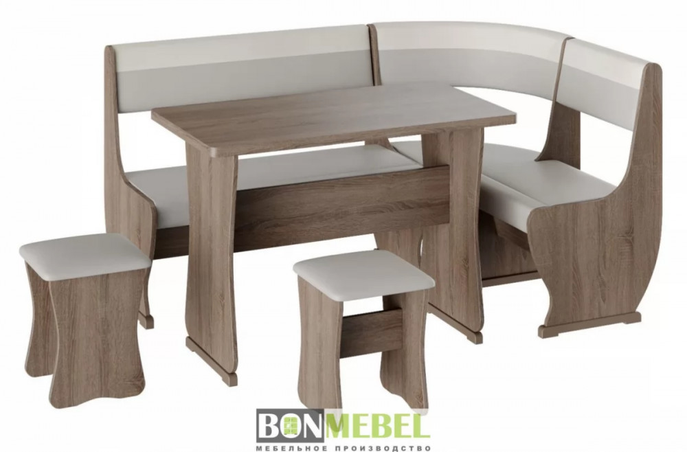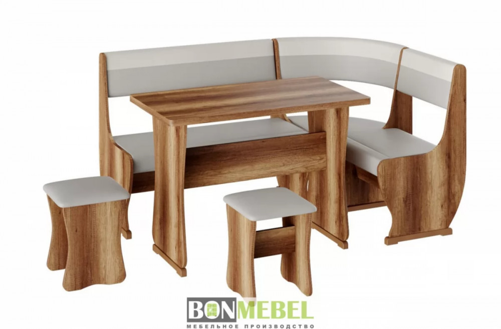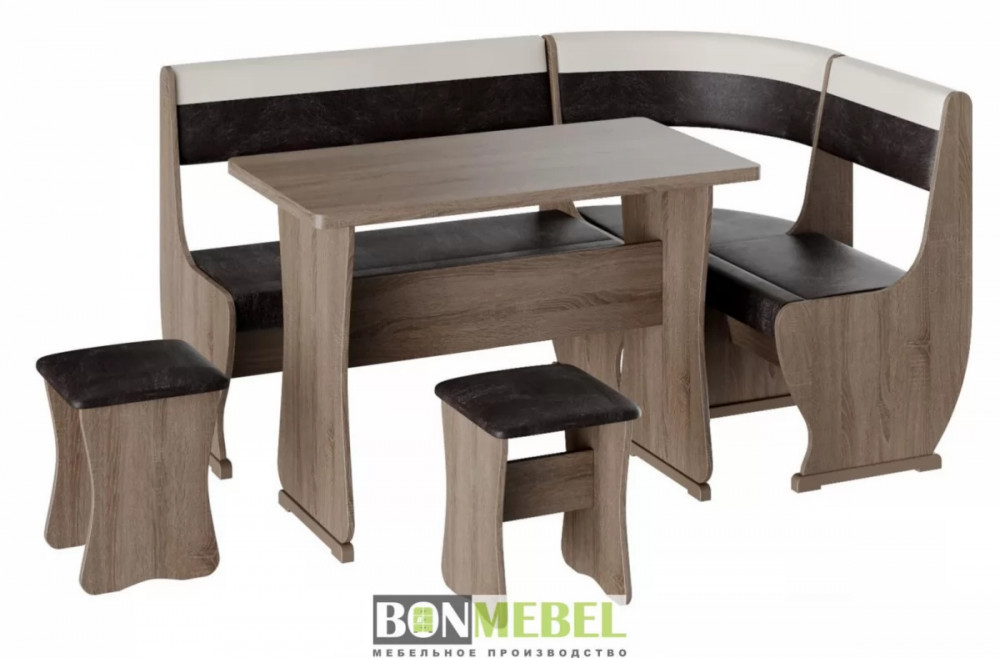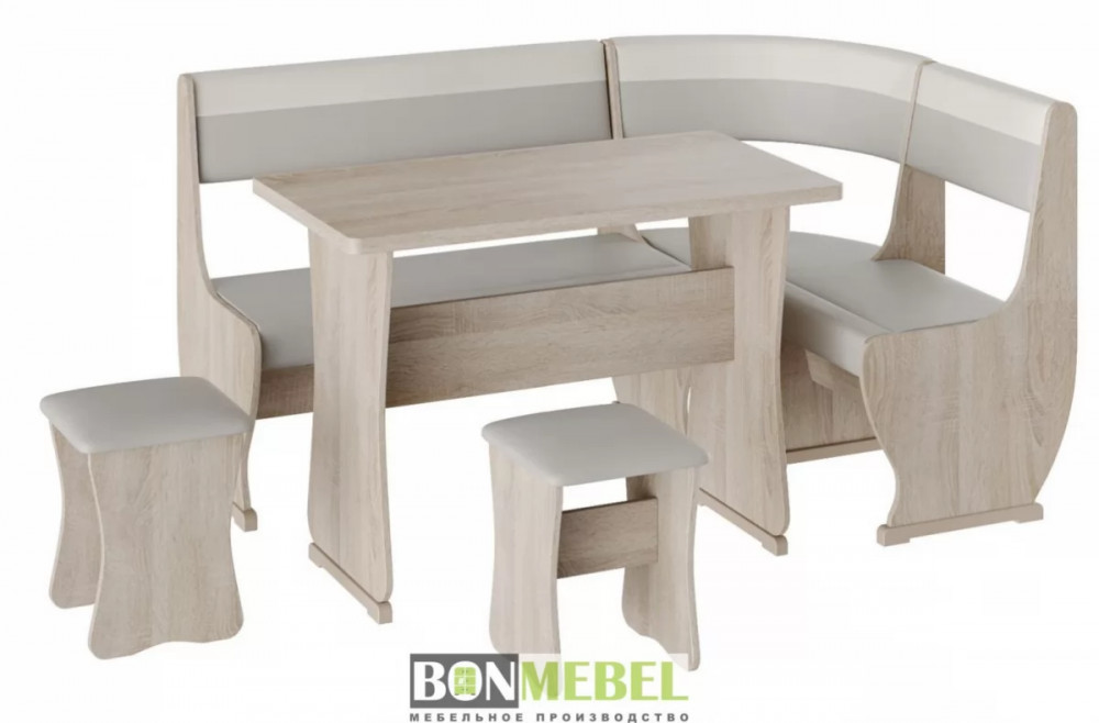 Под сиденьем в скамье предусмотрен ящик. Обивка на табуретах и скамье выполнена из искусственной кожи с наполнителем из поролона. Каркас изделий изготовлен из ЛДСП, на ножках установлены пластиковые накладки.