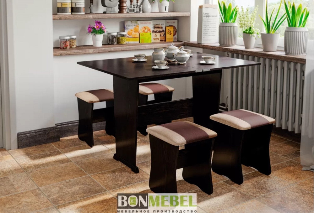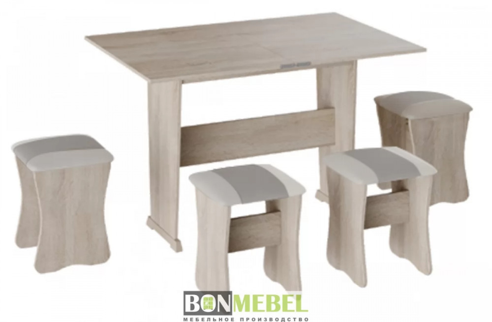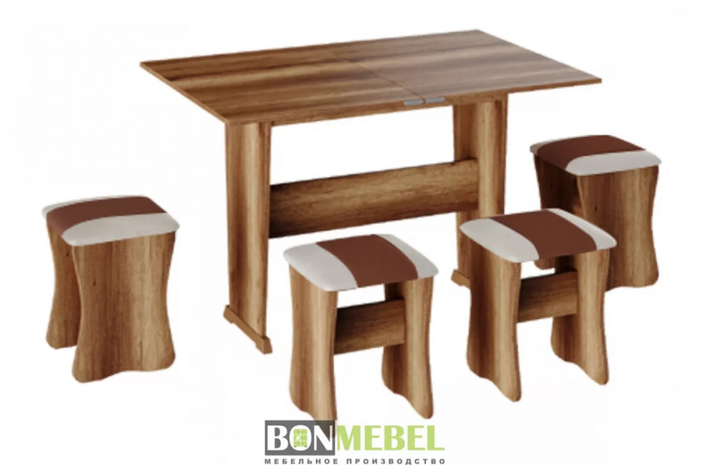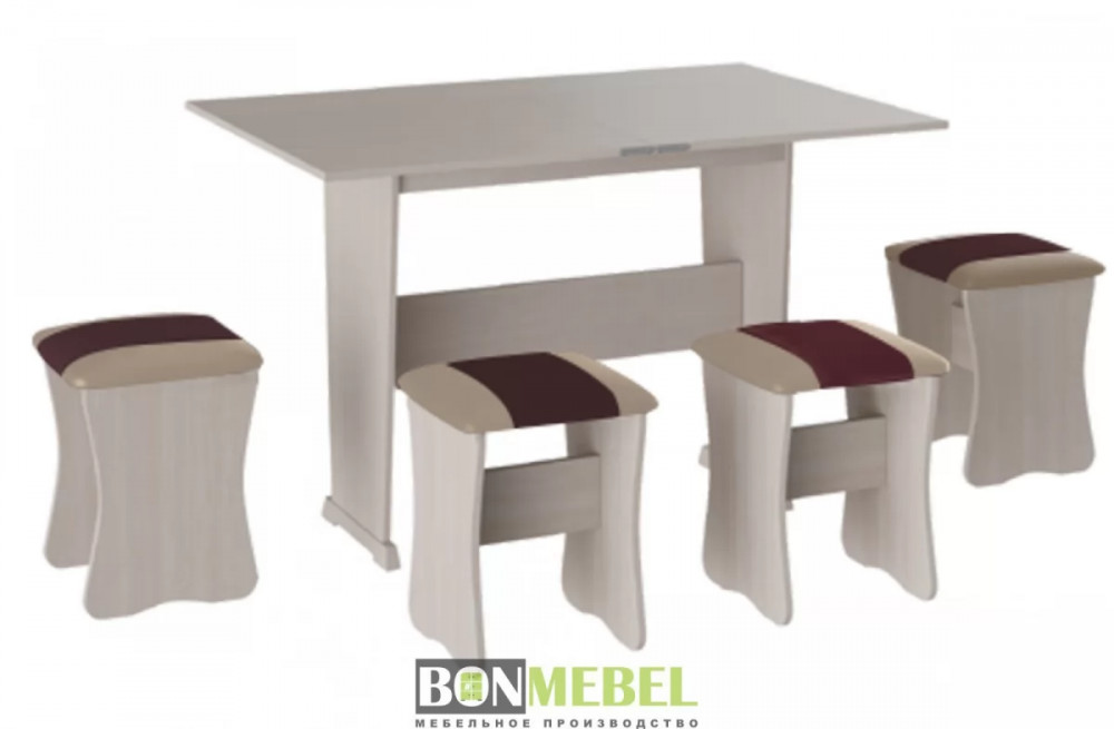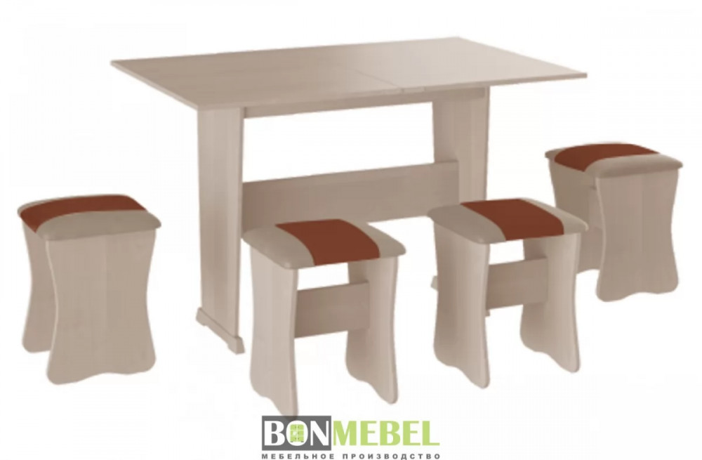 Обеденная группа с табуретами Тип-3 поможет стильно и практично оформить пространство даже на малогабаритной кухне. Комплект рассчитан на четыре персоны. Раскладной стол позволит увеличить ширину стола почти на 40 см за считанные секунды. Обивка из экокожи устойчива к различным загрязнениям и не требует обработки специальными средствами. Мягкие сиденья табуретов имеют мягкое и упругое наполнение, что повышает уровень комфортабельности. Различные варианты расцветки помогут подобрать идеальный комплект. Для изготовления изделий используется прочная ЛДСП. Обивка табуретов выполнена из искусственной кожи.