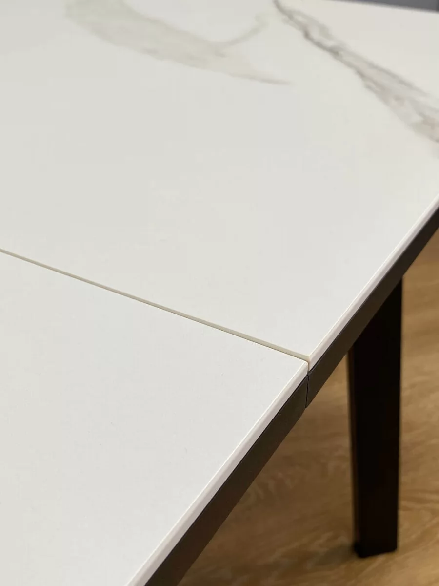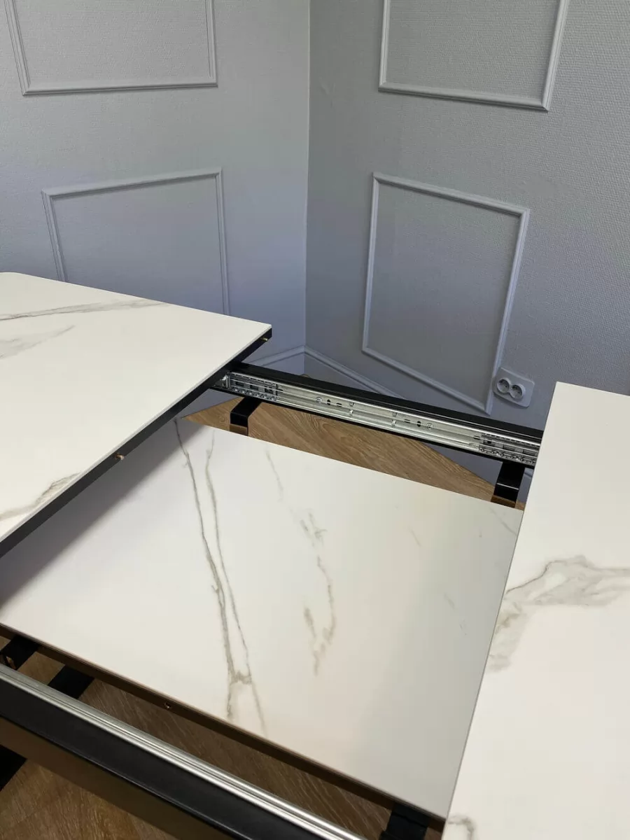 Простой и надежный стол с керамической столешницей со скругленными, безопасными краями и идеальным качеством изготовления, и тонким, но очень прочным подстольем. У стола синхронный механизм раскладки (тянешь за одну половинку и вторая отъезжает сама) и сплошная вставка под столешницей.
