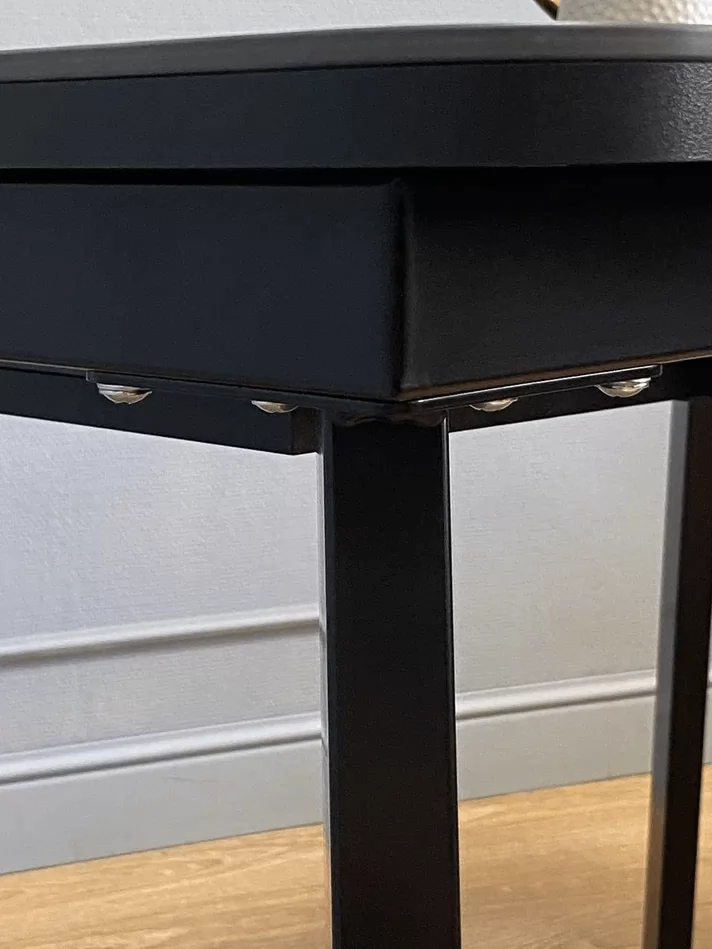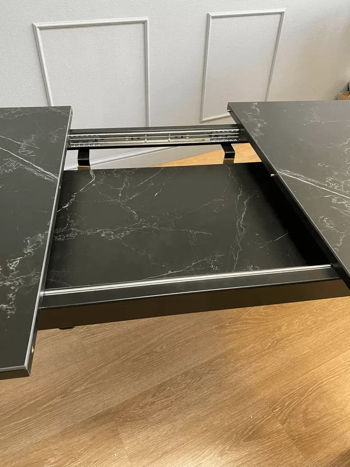 Простой и надежный стол с керамической столешницей со скругленными, безопасными краями и идеальным качеством изготовления, и тонким, но очень прочным подстольем. У стола синхронный механизм раскладки (тянешь за одну половинку и вторая отъезжает сама) и сплошная вставка под столешницей.