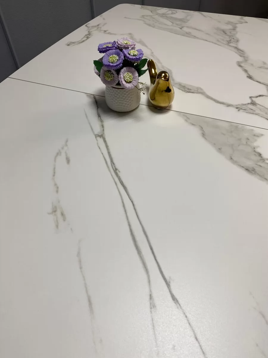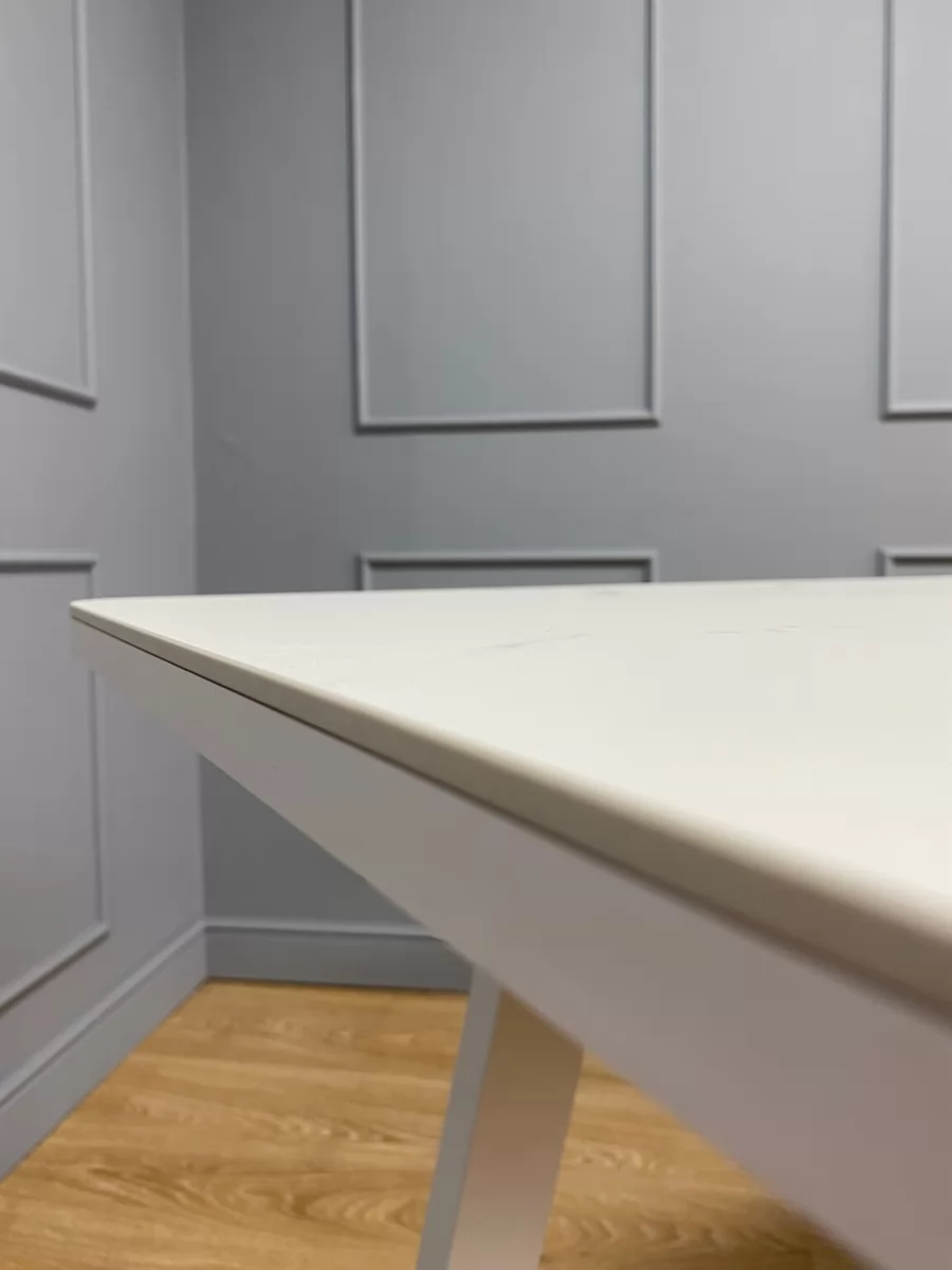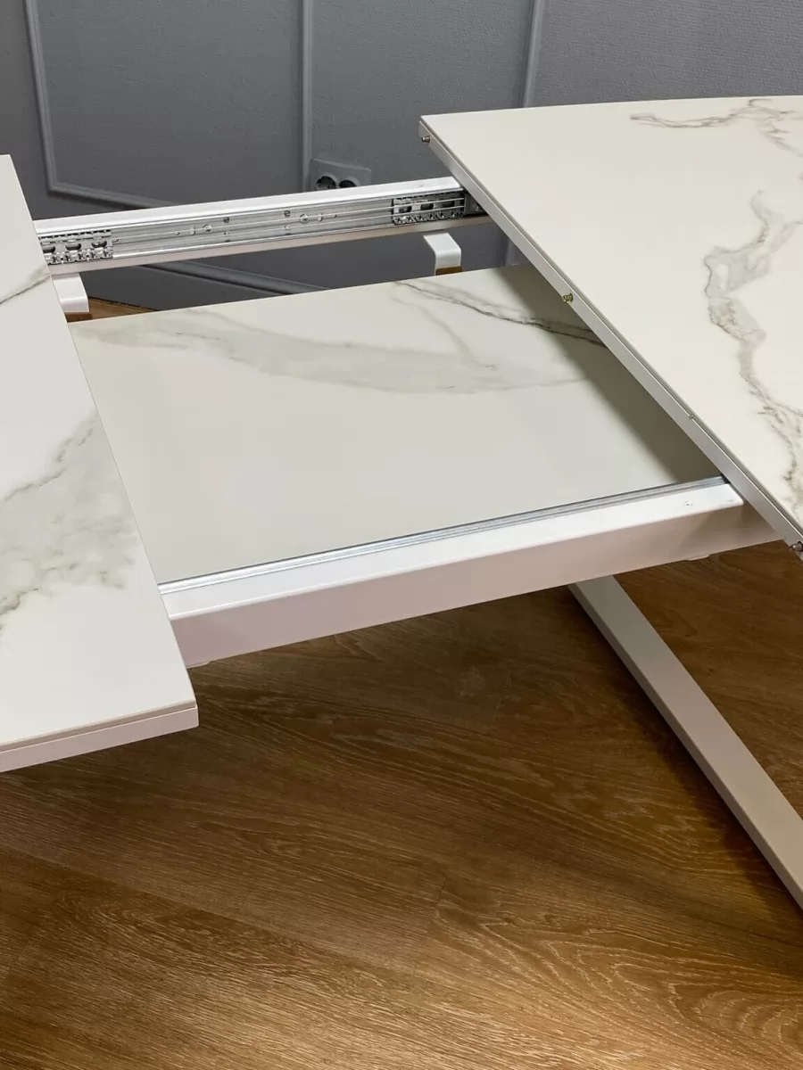 Простой и надежный стол с керамической столешницей, со скругленными, безопасными краями и идеальным качеством изготовления, и тонким, но очень прочным подстольем. У стола синхронный механизм раскладки (тянешь за одну половинку и вторая отъезжает сама), и сплошная вставка под столешницей. Сплошная вставка применяется не для экономии, а для надежности, т.к. керамика очень тяжелая. Сплошная вставка - наиболее беспроблемный и долговечный вариант вставки для стола с керамикой.