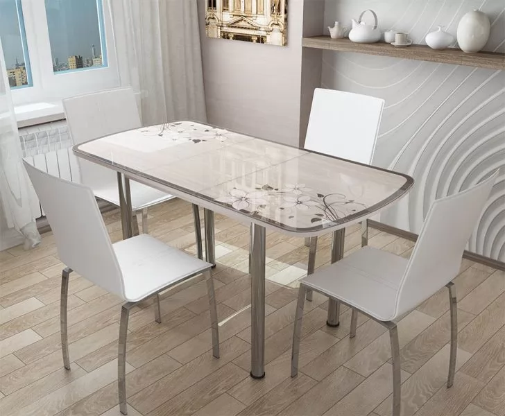 Стол Бостон-3 раздвижной, ваниль, фотопечать/хром брифинг