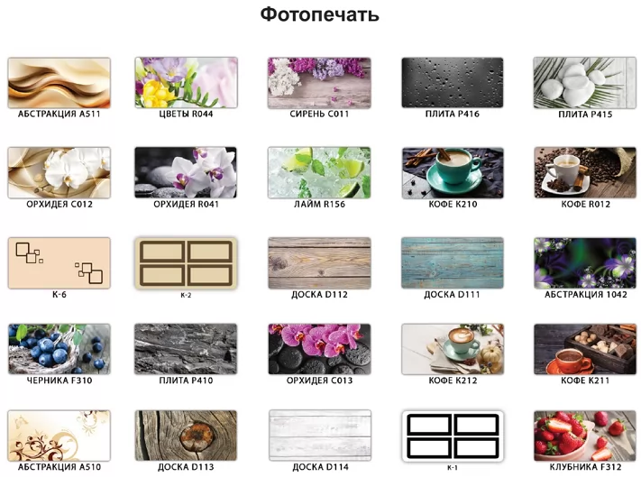 | Фотопечать: | Доска D114, Доска D113, Абстракция А510, Кофе К211, Кофе К212, Орхидея С013, Плита Р410, Черника F310, Абстракция 1042, Доска D111, Доска D112, К-2, К-6, Кофе R012, Кофе К210, Лайм R156, Орхидея R041, Орхидея С012, Плита Р415, Плита Р416, Сирень С011, Цветы R044, Абстракция А511 |